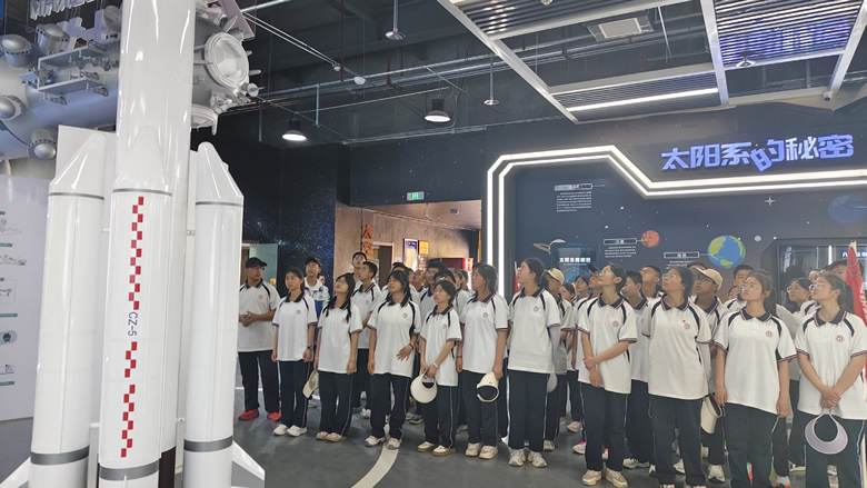 在专业讲解员的带领下,同学们观赏了酒泉卫星发射中心前史展览馆。馆内丰厚的图文材料、宝贵的前史文物以及传神的场景恢复,生动展示了我国航天从无到有、从弱到强的艰苦进程。从“两弹一星”的巨大壮举到载人航天的辉煌成就,再到现在空间站建造的稳步推动,同学们仔细倾听着每一个故事,被老一辈航天人艰苦奋斗、勇于立异的精力深深感动。同学们还近距离观赏了载人航天发射塔架和春风导弹发射塔架,亲眼目睹这些见证我国航天辉煌成就的标志性建筑。“曾经只是在讲义和电视上了解航天常识,这次亲眼看到这些前史材料,才真实感触到我国航天事业的巨大。”八年级学生蔡文慨叹道。最让同学们振奋当属航天员出征典礼的问天阁,同学们亲眼目睹了航天员出征前的预备场所,似乎看到了航天员们雄心壮志、迈向太空的豪放身影,心中的航天愿望也益发火热。